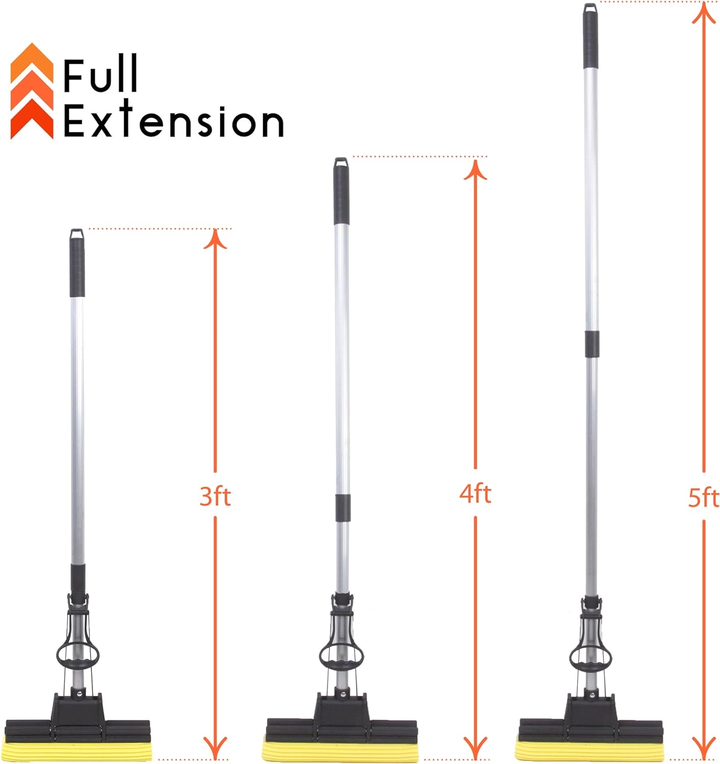 This mop is built with a heavy-duty handle and durable quality. The super absorbent polyvinyl acetate sponge head cleans gently without scratching and is safe for all floor surfaces including tile, laminate, marble and wood. The roller system gives it twice the wringing power over other similar mops. Suitable for commercial, home and industrial applications. It picks up over 5 times more liquid than a regular mop and locks it in place so it doesn’t drip. Instead of pushing water around like a regular mop, the mop cleans, absorbs, and dries all at once. Soak a sponge in warm water for 10 minutes or more until the sponge is completely wet and soft throughout before each use. The hand-operated lever provides effortless wringing and keeps your hands free of dirt and water. It come with 3 aluminum handle comes with pole extension pieces so you can adjust the height to accommodate various heights and tasks. It is specially designed with horizontal grooves to remove, absorb and lift tough dirt, lint, and hair off floors, windows, and other hard surfaces.